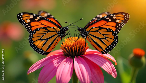 Monarch butterflies delicately perched on a vibrant pink coneflower blossom