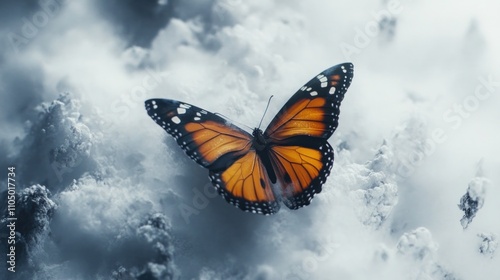 butterfly, monarch, winter, snow, cold, ice, frost, white, orange, black, wing, insect, nature, landscape, scene, season, chilly, glacé, delicate, fragile, beauty, serene, peaceful, quiet, calm, stillness, mysterious, magical, wonder, awe, breathtaking, captivating, stunning, impressive, elegant, graceful, vibrant, colours, contrast, texture, pattern, flight, freedom