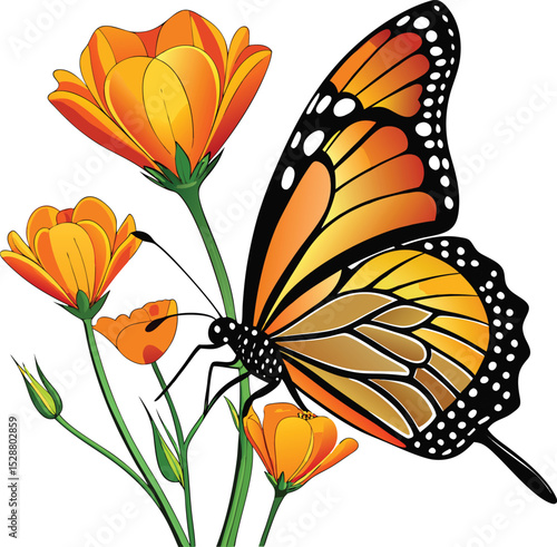 Monarch Butterfly and Orange Flowers Illustration on a White Background