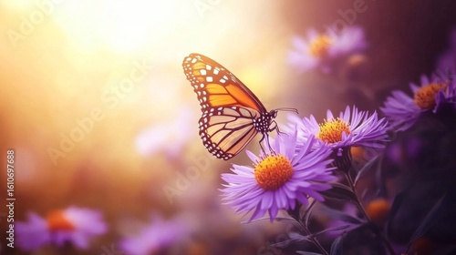 Monarch butterfly feeding on vibrant purple aster flower in blooming summer garden with soft natural floral background