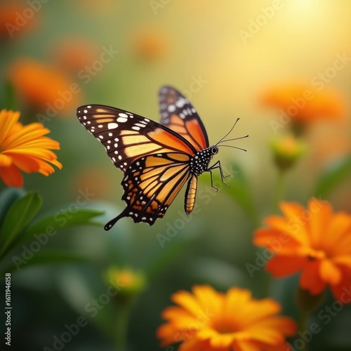 Monarch butterfly in flight amongst vibrant orange flowers