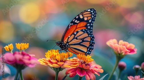 Monarch butterfly on colorful zinnias in a garden.