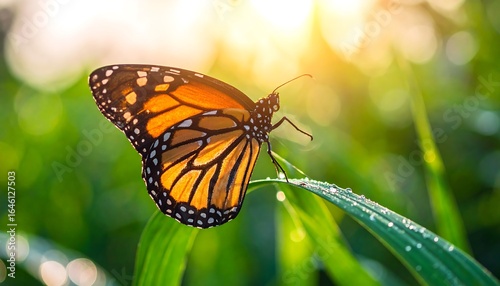 Monarch butterfly on dewy grass at sunrise