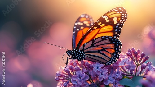 Monarch butterfly on lilac, sunset garden, nature beauty, spring card