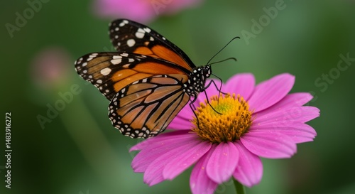 Monarch Butterfly on Pink Flower - A monarch butterfly delicately rests on a vibrant pink flower, symbolizing nature, beauty, transformation, freedom, and serenity