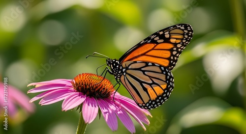 butterfly, monarch, coneflower, purple, flower, insect, wing, nature, garden, wildlife, animal, macro, closeup, photo, summer, spring, pollinator, nectar, plant, bloom, blossom, orange, black, green, leaf, beauty, colours, detail, fauna, flora, arthropod, lepidoptera, insecta, close, up, image, picture, photo, background, soft, sharpened, blurred, bright, vibrant, colourful, natural, earth, environment