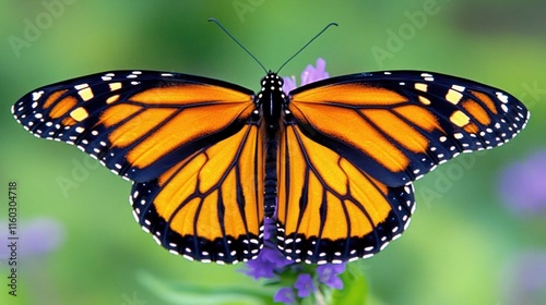Monarch butterfly perched on purple flower, wings spread wide, showcasing vibrant orange, black, and white patterns against a blurred green background.