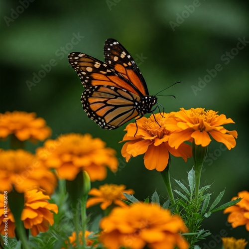 monarch butterfly, butterfly, marigold, orange flower, flower, insect, nature, wildlife, garden, flora, pollination, pollinator, summer, spring, beauty, vibrant, closeup, wing, black, orange, green background, floral, botanical, natural, environment, plant, ecology, botany, seasonal