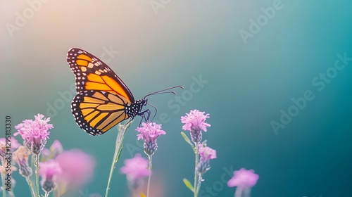 Monarch butterfly perched on vibrant pink flowers against a soft, dreamy background