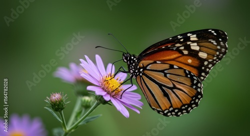 Monarch butterfly resting on purple aster flower in nature's tranquility
