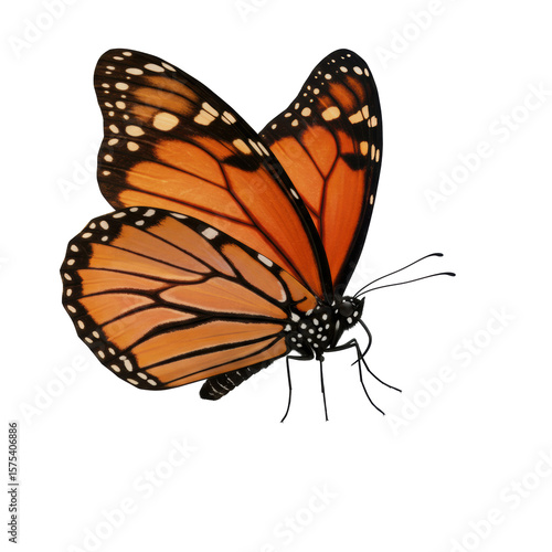 Monarch butterfly with vibrant orange wings, intricate black veins, white spots, detailed antennae, and slender body, isolated on a transparent background with a soft shadow, shot from a high