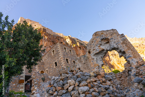 Monemvasia, Greece - 12 February 2023 - View on the island of Monemvasia at a old arch and the upper town