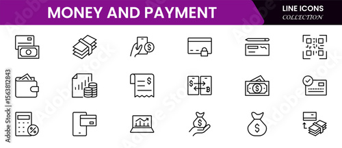 Money and payment are simple, minimal, thin line icons. Related money, credit card, atm, purchase, bill. Editable stroke. Vector illustration.