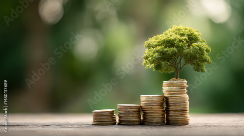 Money coin stack growing graph with tree bokeh background, investment concept, business finance and, save money concept