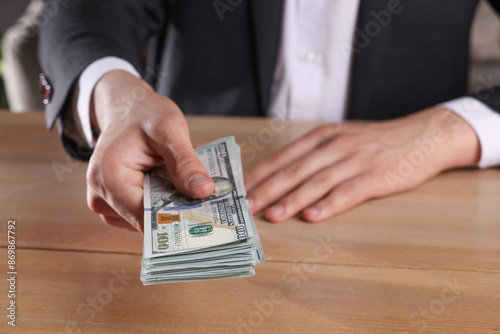Money exchange. Man holding dollar banknotes at wooden table, closeup