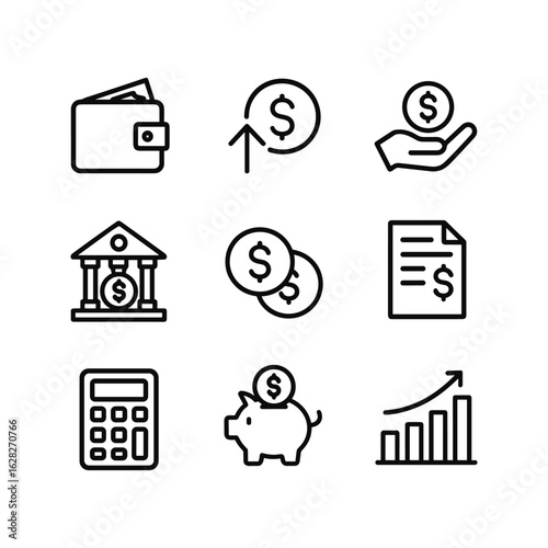 icon, money, line, management, finance, personal, banking, investment, savings, budget, wealth, economy, financial, currency, cash, credit, debit, loan, mortgage, insurance, vector, signs, symbol, outline, black, linear, retirement, portfolio, asset, income, expense, profit, loss, planning, accounting, payment, transaction, calculating machine, billfold, coin, dollar, euro, business, economic, growth, chart, graph