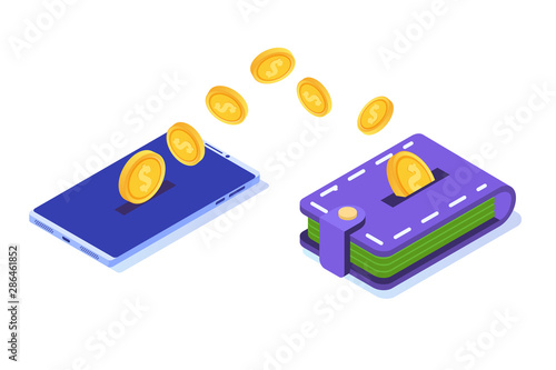 Money transfer from smartphone to wallet. Isometric vector illustration.