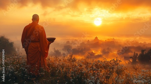 monastic, bowl, walking, village, sunrise, peaceful, mindful, living, simplicity, practice, meditation, spiritual, serene, tranquil, landscape, nature, silhouette, fog, mist, glow, light, ray, sun, morning, early, horizon, path, trail, dirt, field, flower, plant, foliage, vegetation, atmosphere, sky, cloud, calm, contemplative, aethereal, contemplation, devotion, faith, nirvana, solitude, ritual, ceremony, pilgrimage