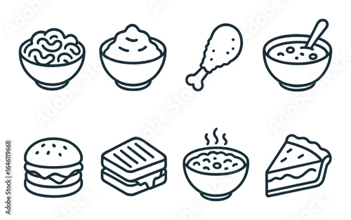 Monochrome food icons: soup, rice, chicken, burger, sandwich, pie