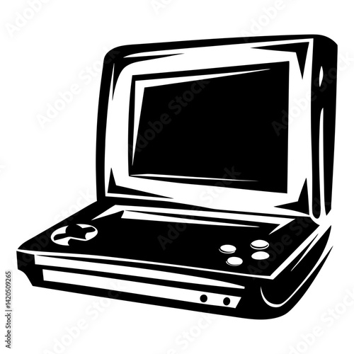 hand-held, game, console, gaming, device, retro, vintage, monochrome, black, white, illustration, vector, graphic, portable, entertainment, screen, buttons, directional, pad, control, analog, stick, player, video game, old school, technology, electronic, gameplay, system, fun, leisure, classic, design, silhouette
