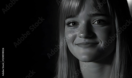 woman, girl, portrait, monochrome, black-and-white, freckle, smile, hair, face, young, model, beauty, dark, moody, contemplative, serious, mysterious, emotion, expression, light, shadow, photo, artistic, head shot, closeup, indoor, studio, elegant, attractive, feminine, candid, natural, gentle, peaceful