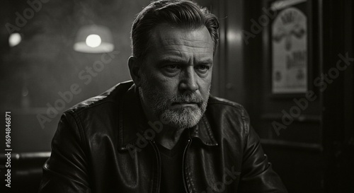 Monochrome portrait of an introspective man in a leather jacket, gazing downwards in a bar setting. Moody and dramatic lighting.