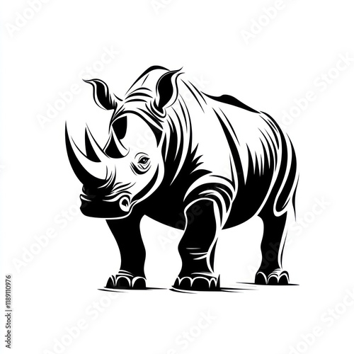 Monochrome rhino illustration, African savanna background, wildlife design, logo use
