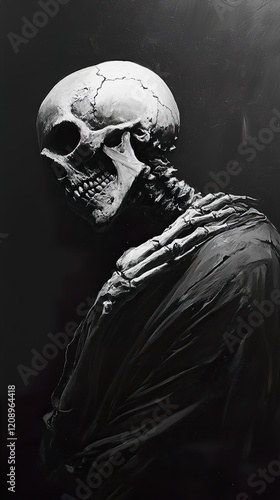 skull, bone, skeleton, death, dark, monochrome, black, white, morbid, gothic, grisly, shadow, texture, paint, art, painting, still, life, creepy, mystery, vintage, antique, old, decay, grim, sombre, melancholy, despair, loneliness, isolated, brooding, thoughtful, pensive, reflective, introspective, enigmatic, mysterious, dramatic, intense, powerful, emotional, symbolism, mortality, vanity, reminder, passage, time