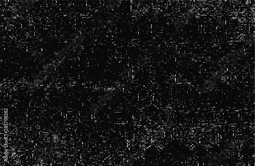 Monochrome texture composed of irregular graphic elements. Distressed uneven grunge background. Abstract vector illustration. Overlay for interesting effect and depth. Isolated on white background.