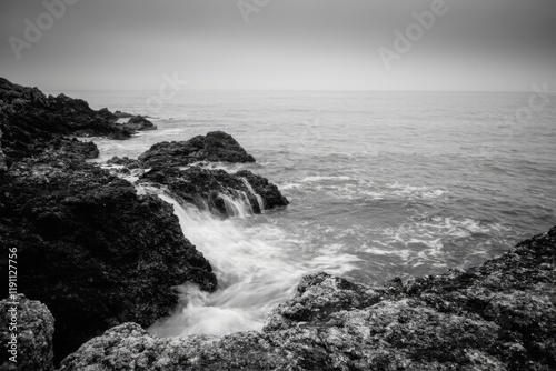 Monochrome View of a Rocky Coastline and Ocean Waves in Motion