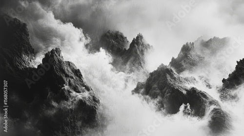 monotone, landscape, rocky, peak, cloud, mist, monochrome, fog, dramatic, mountain, aerial, texture, abstract, grey, white, black, stormy, wave, spray, power, nature, scenic, rugged, elevation, cliff, formation, depth, contrast, intensity, aethereal