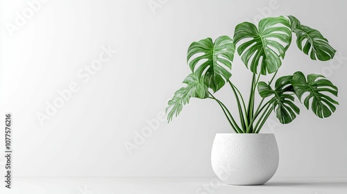 Monstera Deliciosa Plant in White Pot Against White Wall
