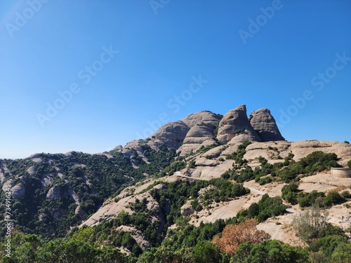 mountain, landscape, sky, nature, mountain, travel, rock, forest, summer, green, view, tree, hill, tour tourism, europa, cloud, stone, rock, grass, cloud, peak, outdoors, spain, montserrat, natural, cliff, desert, tree, park, scenery