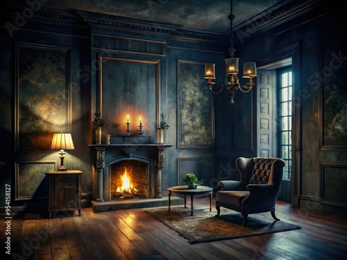 mysterious, eerie, intriguing, shadowy, flickering, fireplace, ominous, foreboding, creepy, haunting, atmospheric, sombre, candlelit, old, vintage, antique, gothic, abandoned, decrepit, forgotten, concealed, mystical, supernatural, ghostly, haunted, strange, uneasy, nervous, tense, thrilling, chilling, darkened, dusky