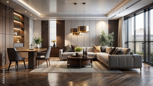 Moody Clarity modern minimalist chic ambiance white walls dark wood furniture sleek lines rich textures golden hour soft focus depth of field blur