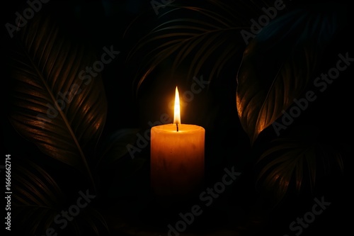 Moody Dark Scene with Golden Candle, Tropical Leaves, and Cozy Atmosphere