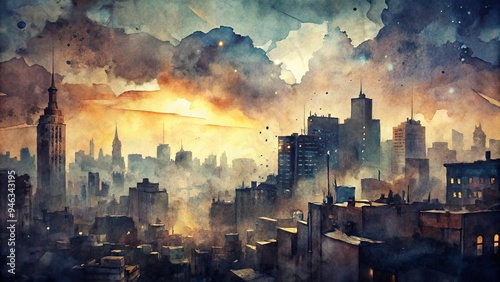 Moody, dreamy watercolor illustration of a grungy cityscape at dusk, with torn paper textures and muted colors evoking a sense of urban melancholy and nostalgia.