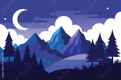 winter, landscape, snow, night, christmas, tree, sky, mountain, moon, vector, nature, illustration, forest, cold, star, pine, mountain, christmas, blue, season, star, holiday, hill, decoration, ice