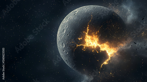 Moon cracked with fiery impact in dark space scene. Lunar Fracture. Illustration