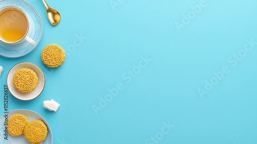 Mooncakes and traditional Chinese tea set with a blank text zone for 3D Minimalist modern design featuring mooncake pastry ceramic tea cups and pot on a plain background