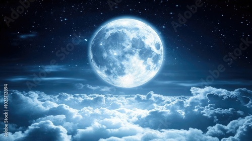 Moonlight shining on clouds, mystical night scene with a full moon.