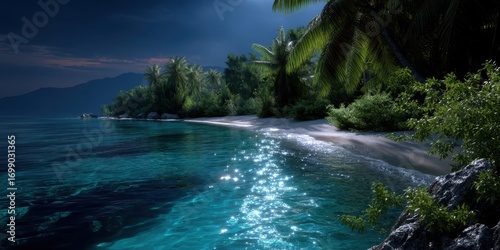 Moonlit tropical beach with calm waves and lush palm trees at night
