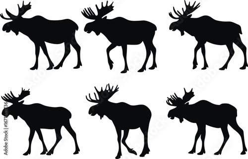 Moose silhouette collection, wildlife animal shapes, black forest icons, antlered mammals, nature illustration, hunting design, vector clipart, isolated set