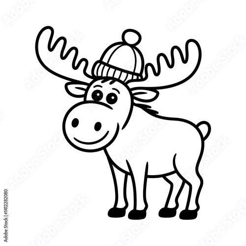 Moose with big antlers and tiny hat Coloring page, black and white