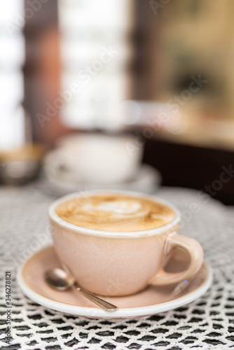 Morning Coffee Cappuccino on Table with Blurred Background