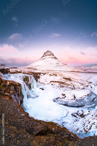 Morning landscape view on Mount Kirkjufell and Kirkjufellfoss waterfall in Iceland. Picturesque sky at winter sunrise.