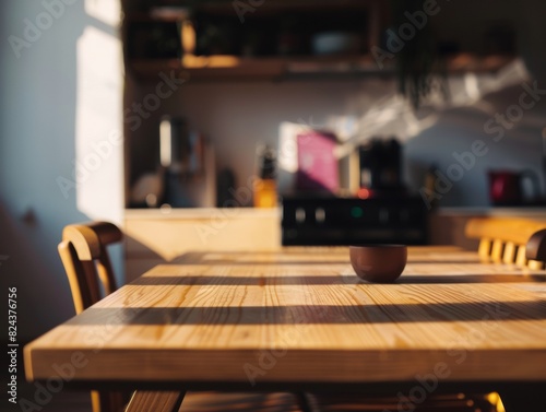 Morning Light in a Bright, Modern Kitchen - Bamboo Table with Blurry Lively Background Ideal for Product Display