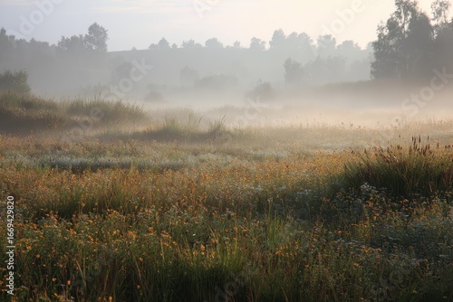 Morning mist envelops a wild meadow, showcasing serene beauty in natural surroundings during the early hours of the day