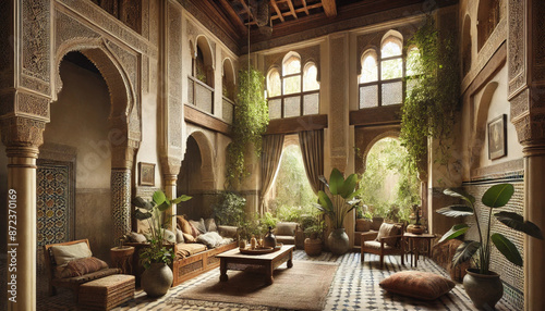 Moroccan Riad Courtyard with Lush Greenery and Ornate Architecture