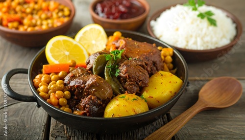 tagine, moroccan, food, cookery, dish, meal, chickpea, vegetable, meat, stew, dinner, lunch, eating, epicure, traditional, spice, lemon, healthy, rustic, wooden, table, cooked, delicious, oriental, arabian, cultural, ethnic, flavorful, closeup, presentation, white rice, carrot, potato, green pepper, cilantro, herb, home cooked, appetence, nourishment, background, bowl, vegetarian, vegan, culinary, gastronomic